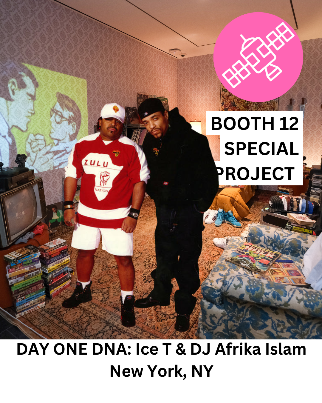 DAY ONE DNA presented by Ice T and DJ Afrika Islam. DAY ONE DNA features a full Bedroom Installation recreating DJ Afrika Islam’s 1980s South Bronx apartment. The apartment was a key gathering point for pioneering New York hip-hop artists, where Ice T immersed himself in the scene and met figures like Grandmaster Caz and Melle Mel. It was here that Ice T and Afrika Islam collaborated on Rhyme Pays (1987), leading to Ice T's signing with Sire Records as the label's sole hip-hop act among artists like Madonna and The Smiths.