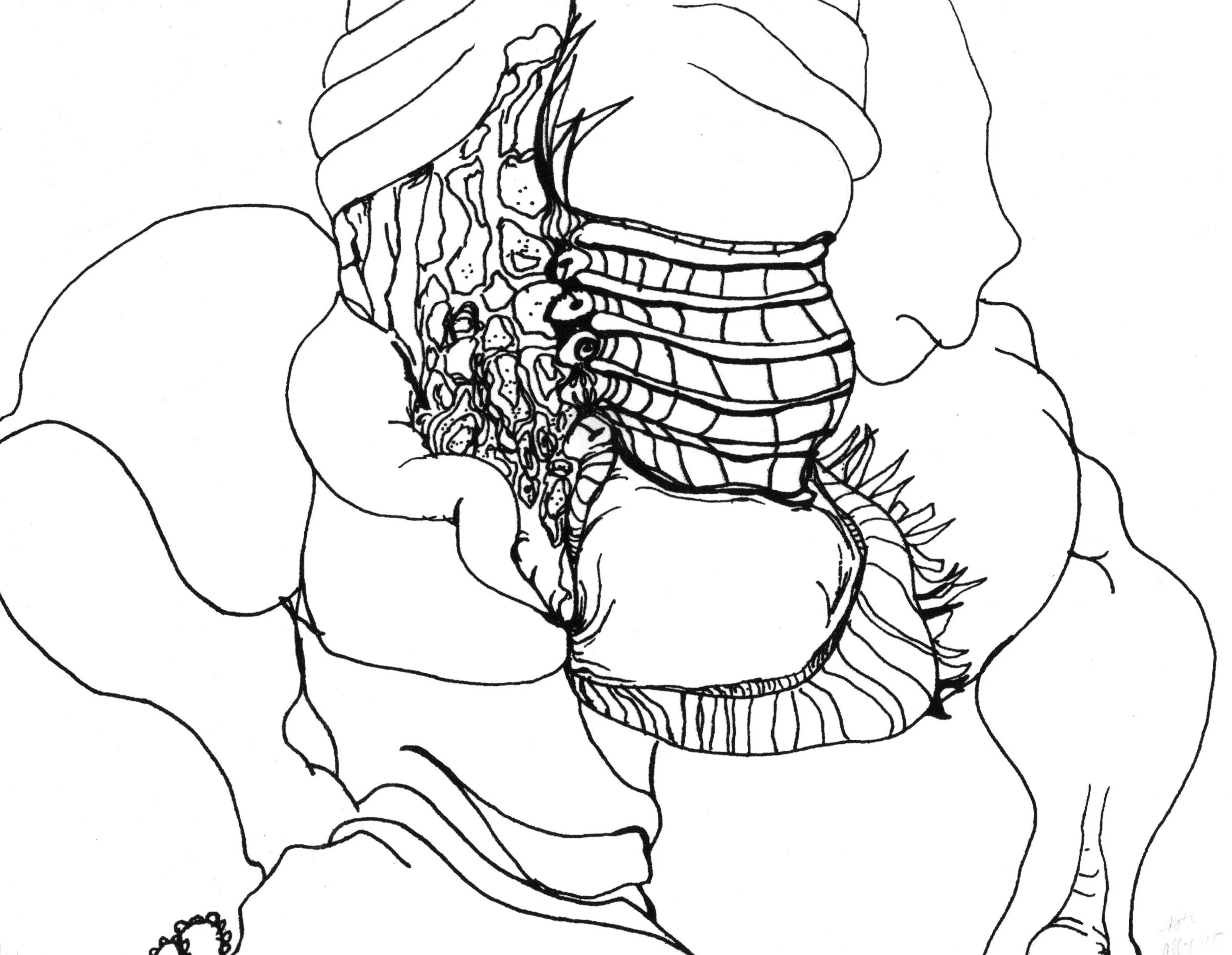 Ink on Bristol Paper | 11”x 14” | 2022 | Kate Alboreo is a Brooklyn based artist who creates paintings and drawings that explore survival, queerness, sexuality, the slow violence of aging, the mundane violence of living socially, and the subtle violence of self-destructive patterns. Using wrestlers as recurring figures, Alboreo stages scenes of entanglement, struggle, and suspended dominance, examining the choreography of contact and the blurred boundary between violence and care. These figures often appear alongside or intertwined with plant life—trees, vines, invasive species—that act as quiet witnesses or active participants, suggesting cycles of growth, decay, and adaptation.